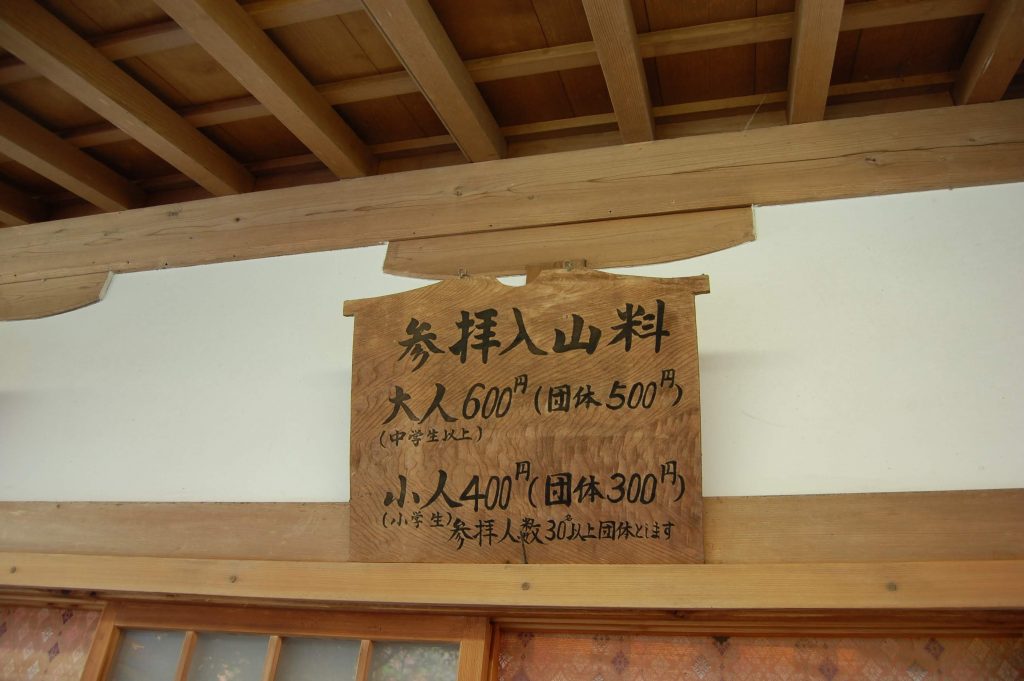 参拝料は大人600円・子供400円、拝観時間は(4月1日~11月30日 )8:30~17:00、(12月1日~3月31日)9:00~16:00です。