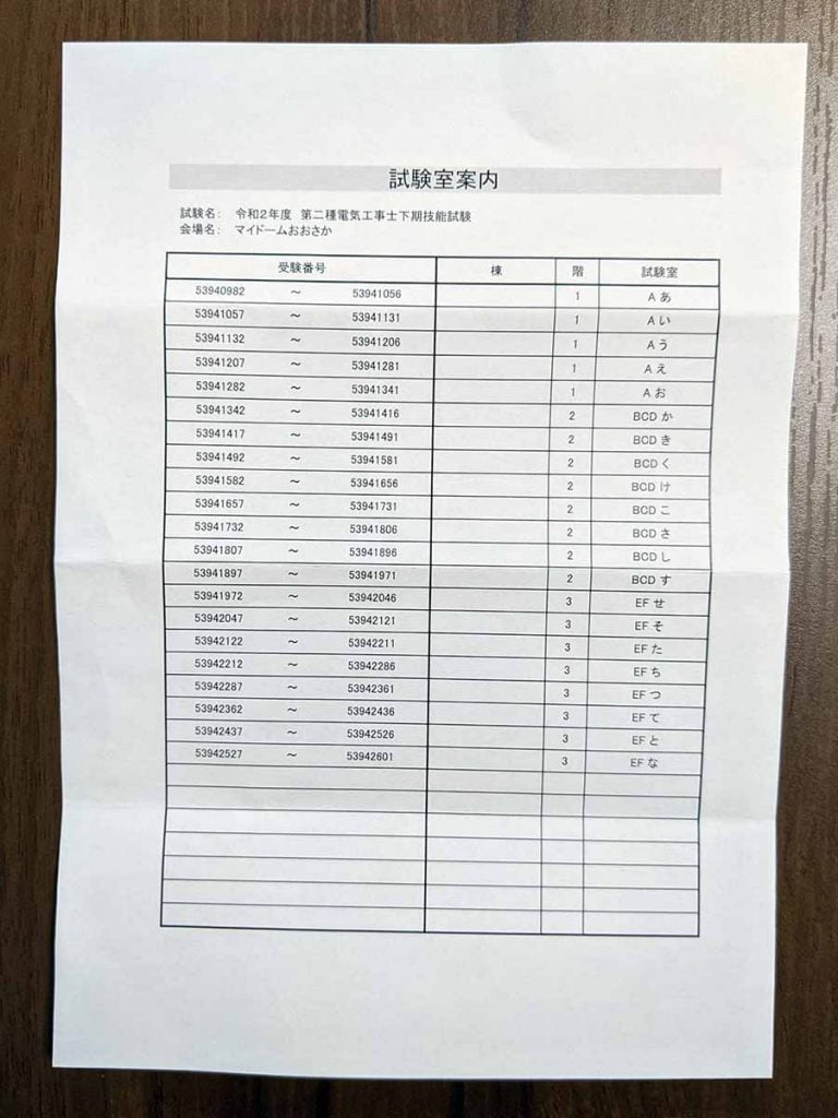 受験番号ごとの試験室の振り分けが示されているA5サイズの小さな紙です。